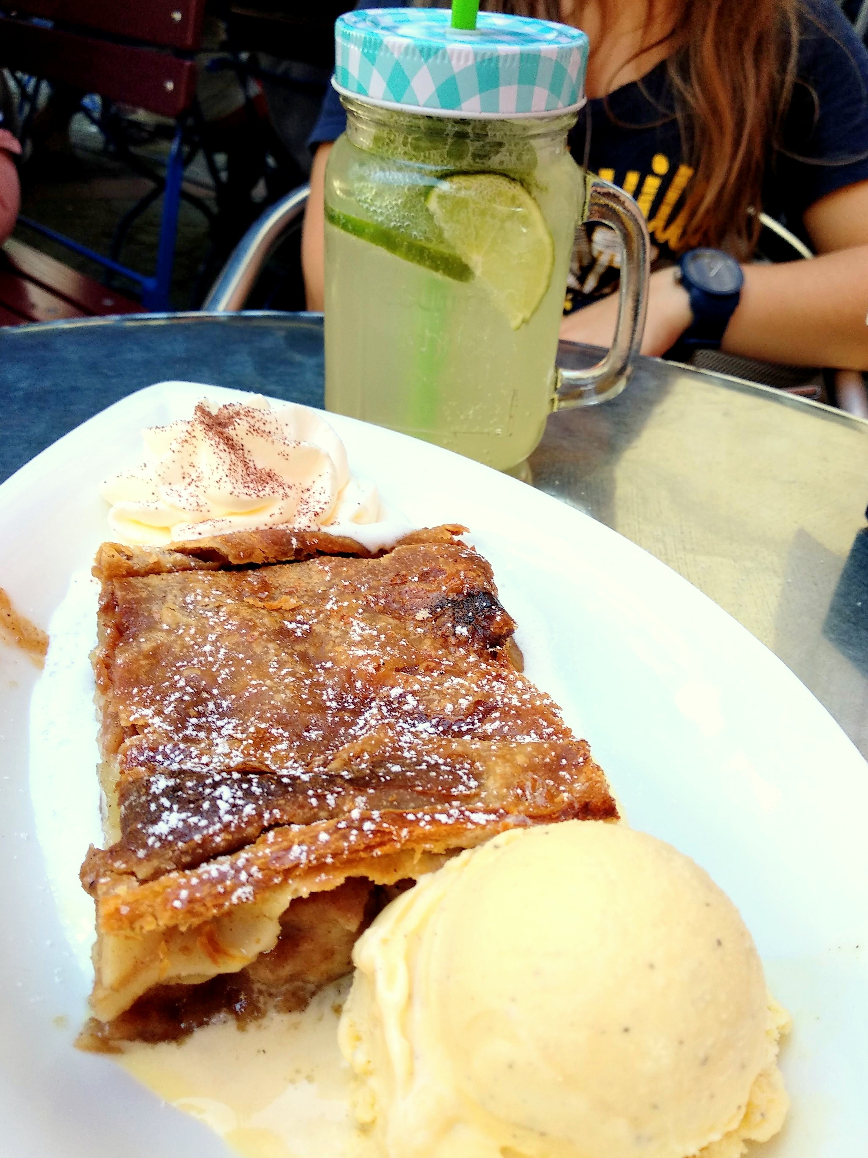 В здешнем штруделе действительно очень много яблок, причем нарезанных крупными дольками, и тоненький слой теста. Подают его с ванильным мороженым и взбитыми сливками. Еще здесь волшебно готовят какао, а Апероль Шприц приносят вместе со стаканчиком соленого арахиса.