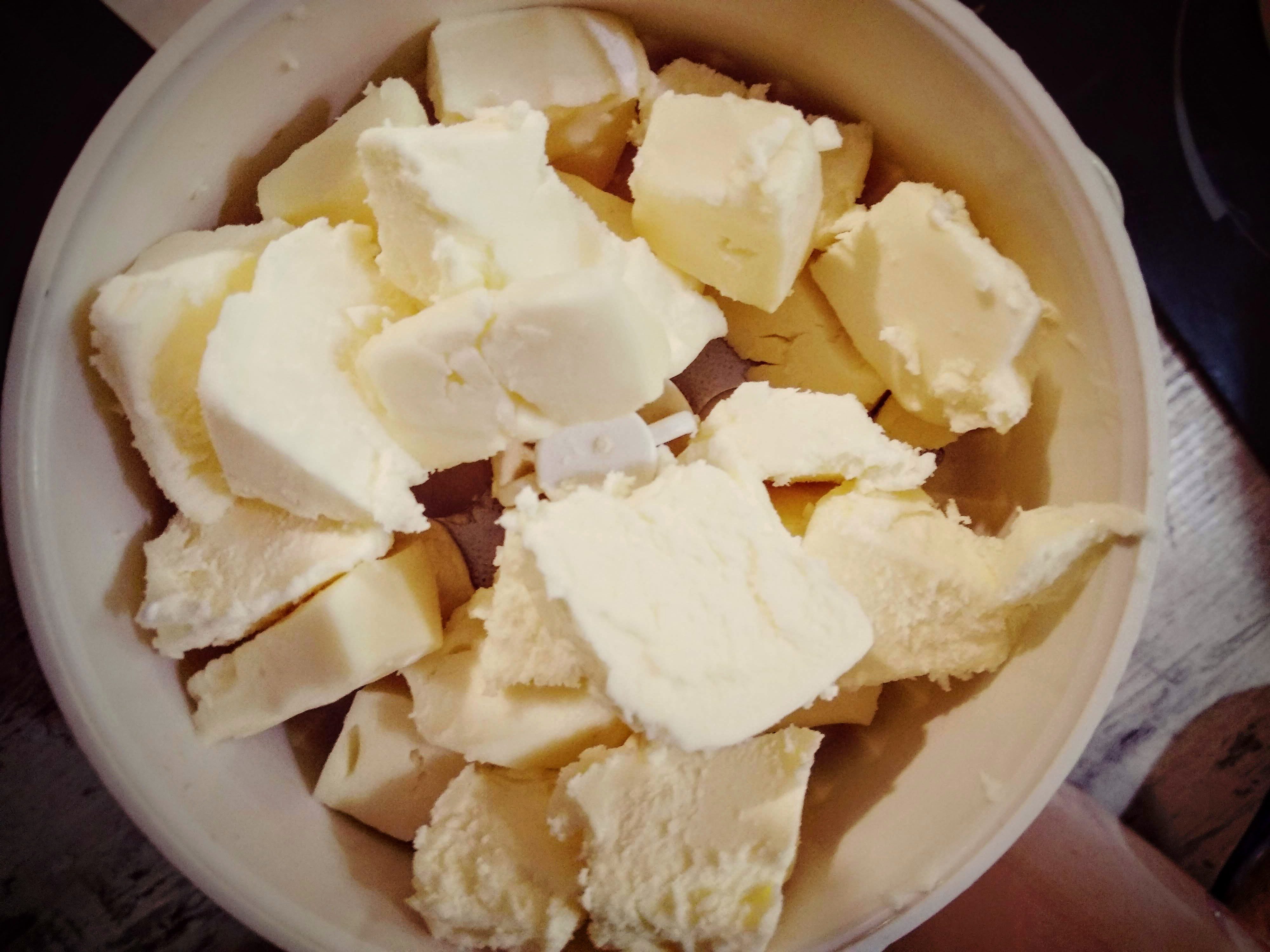 2. Срезаем корку с Бри, сыр и масло нарезаем кубиками, помещаем в чашу блендера.